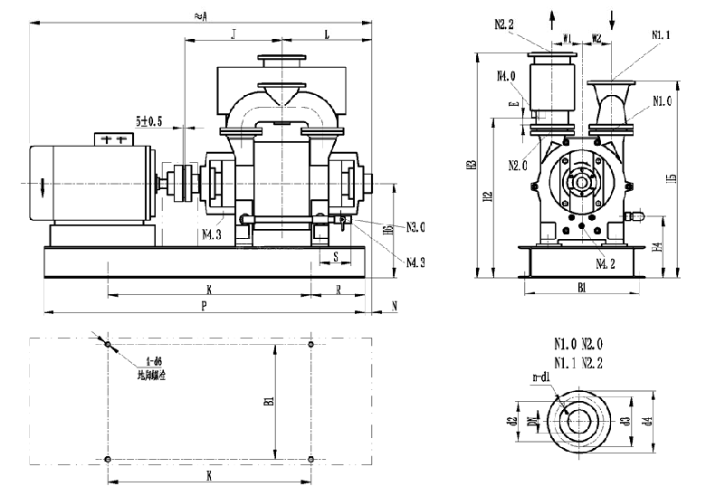 | N1.0进气端法兰 N1.1连通管法兰 N2.0排气端法兰 N2.2分离器法兰 N3.0工作液接口 N4.0分离器排液口 N4.2冲洗、排液口 N4.3泄漏液排放口 |