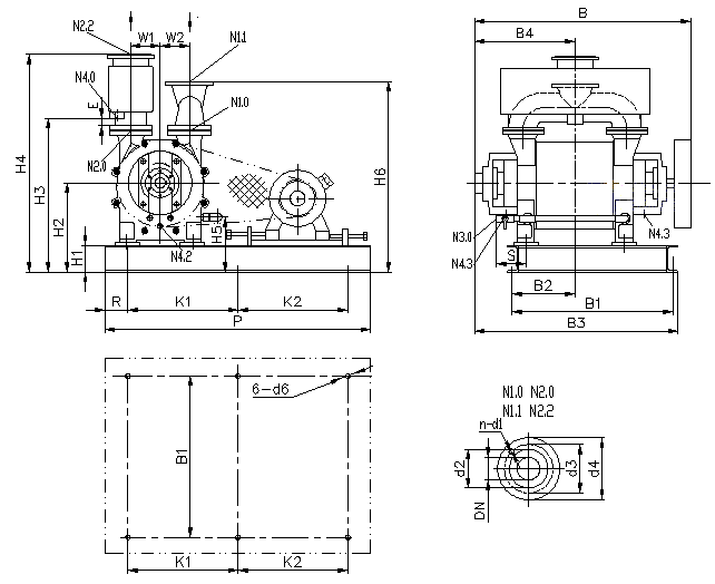 | N1.0进气端法兰 N1.1连通管法兰 N2.0排气端法兰 N2.2分离器法兰 N3.0工作液接口 N4.0分离器排液口 N4.2冲洗、排液口 N4.3泄漏液排放口 |
